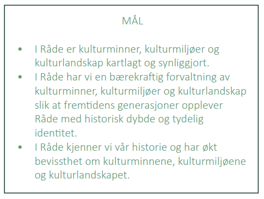 Et representativt utvalg av kulturminner og kulturmiljøer skal bevares i et langsiktig perspektiv. I dette ligger forståelsen av at vi ikke kan ta vare på alt, men at vi må velge. Det er viktig at både fortid, nåtid og fremtid ses samlet i arbeidet med utformingen av våre fysiske omgivelser. Det betyr at vi må klare å kombinere samfunnsutvikling og kulturminneforvaltning. Kommunedelplan for kulturminner, kulturmiljøer og kulturlandskap i Råde kommune skal gi et grunnlag for dette arbeidet.